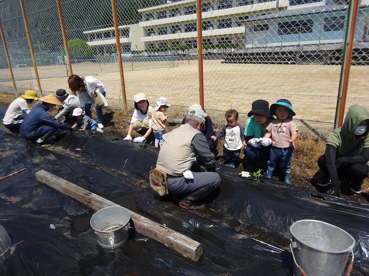 5月16日(火)おひさま農園の農園開きがあり、8組の親子がヤーコンの苗植えととうもろこしの種まきをしました。初回は畑の先生に農園の伝統野菜や親子で土に触れたり作物を育てる大切さについてお話していただき、みんなでのんびりと畑に向かいました。