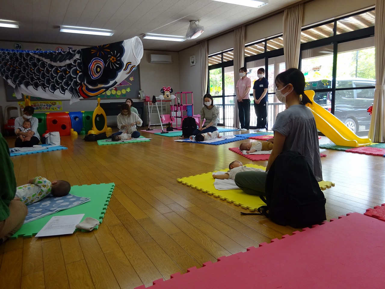 5月22日(月)北児童館で「ベビーマッサージ講座」をおこない、6組の親子が参加しました。 先月も参加した赤ちゃんは、よく動くようになったり大きな声も出せるようになるなど成長の姿がたくさんみられました。先生は、赤ちゃんの背中スイッチやスマホに関する話など体験談を交えて興味深い話もたくさんしてくださり、お母さん方はとても真剣に耳を傾けていました。 マッサージが始まると、声を上げて気持ちよさそうにしていた赤ちゃんたちでした。