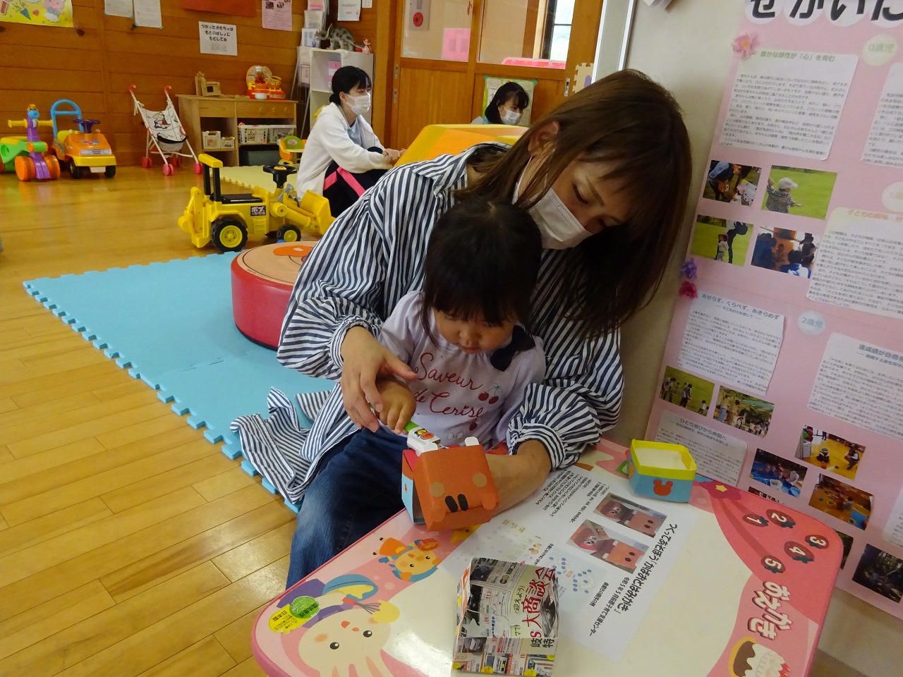虫歯予防デーの向けてはみがきが楽しくなる製作キットを用意しました。 アンパンマンの歯ブラシでかばおくんの歯を磨くとバイキンマンとカビルンルンが落ちる仕掛けです。 支援センターで作ったお子さんたちはとても気に入ってしばらくゴシゴシと磨いてあげていました。 おうちでの歯磨きがスムーズになったという感想もいただき、嬉しかったです。