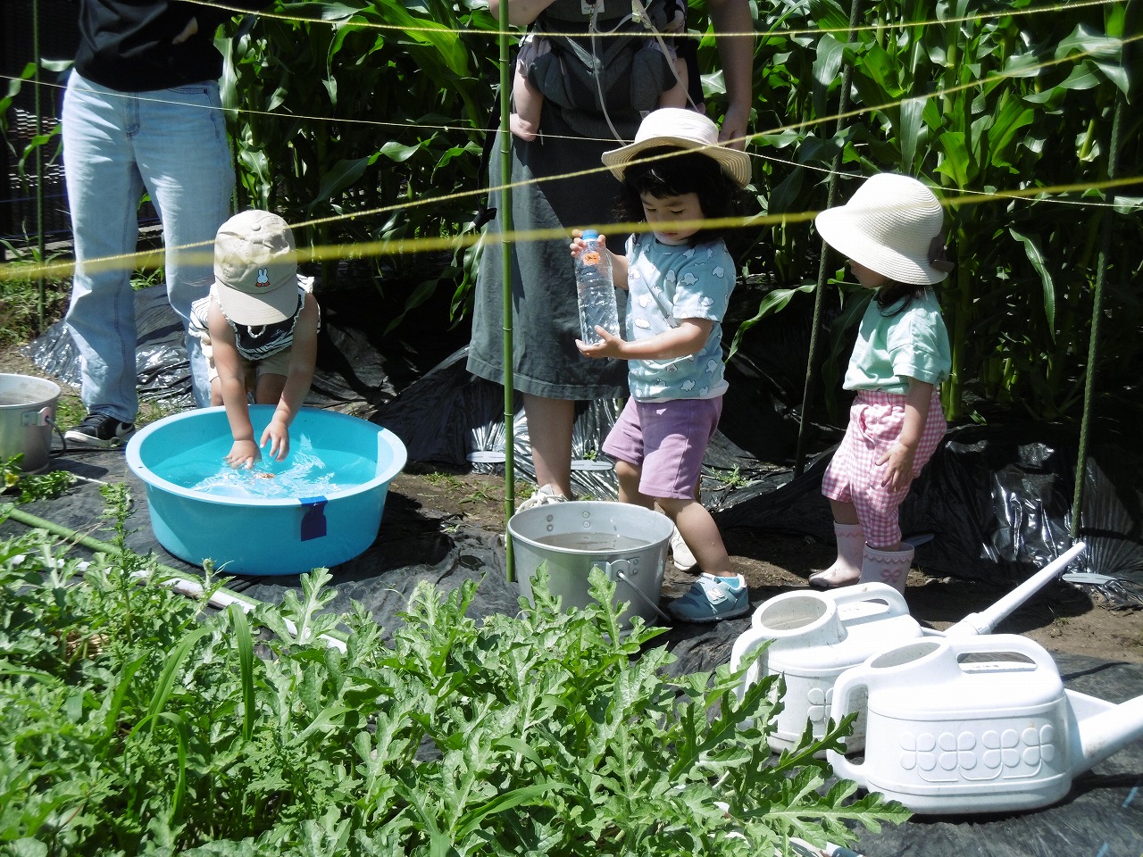 7月4日(火)農園デーをおこない、8組の親子が参加されました。 先週より更に大きく生長したとうもろこし。大人もくぐれるくらいのトンネルになっていました。 しっかり花もついていたので、あとは動物に食べられないように実が大きくなるのを楽しみにしたいと思います。 ヤーコンも葉がグングン生長中です。最終的に大人よりも背が高くなることを伝えると、とても驚いていたお母さん方でした。