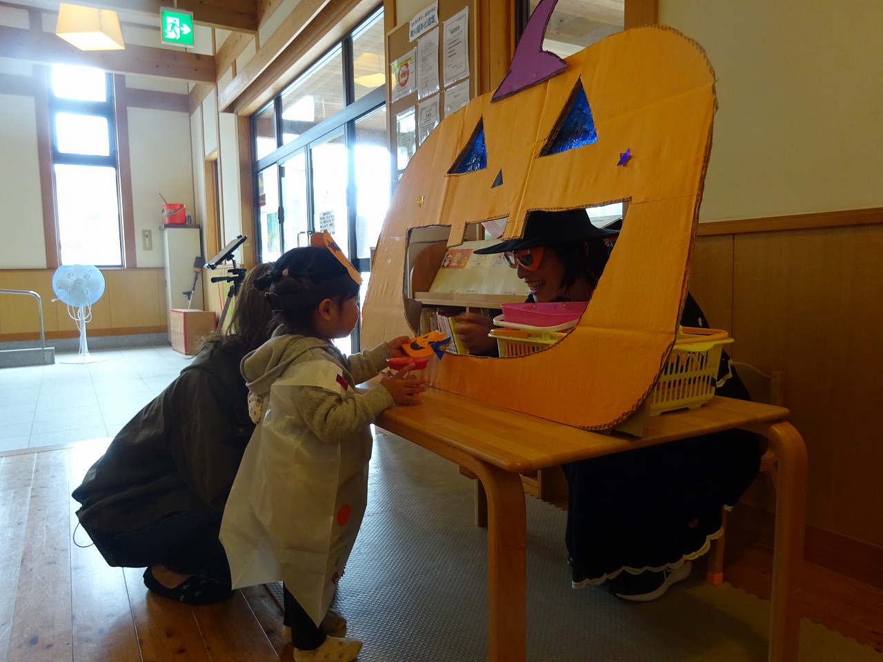 親子でかぼちゃのお面、ビニール袋でおばけの衣装、お米が入ったマラカスを作り、仮装をして園内を巡りました。園児のお兄さん、お姉さんたちが「ハッピーハロウィン!」と手を振ってくれたのでお子さんたちはとても嬉しそうに手を振って歩いていました。ゴールでは、大きなカボチャおばけの口からかわいい魔女さんが顔をのぞかせていました。「トリックオアトリート」と言うとおみやげがもらえたので、ドキドキしながら受け取る姿がとてもかわいかっです。