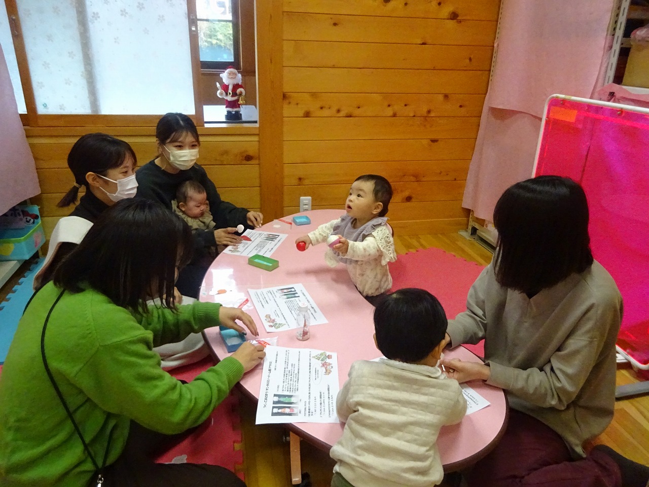 11月のつくってあそぼうは、乳酸菌飲料のボトルに古いお米と丸い発砲スチロールを入れたマラカスを作りました。親子でサンタとツリーにシールを貼ってボトルの中に入れて振ると発砲スチロールが静電気でふわふわと浮き上がり、スノードームのようになります。作った後は赤ちゃんたちも気に入って握ったり振ったり眺めたりしながら楽しんでいました。 クリスマスのおもしろクイズでママにもプレゼントがあったので喜んでいただけました。