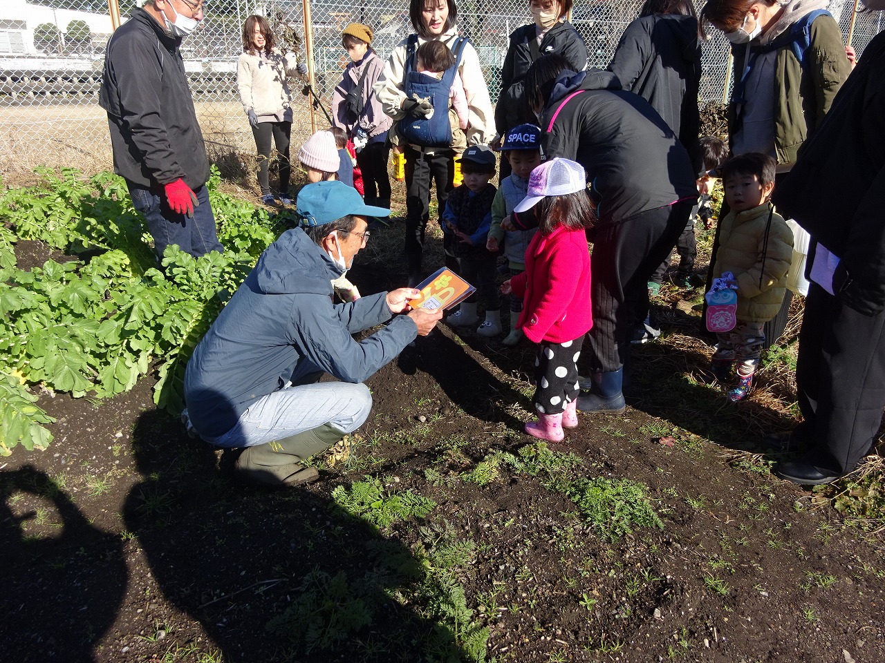 12月4日(月)今年度最後のおひさま農園デーをおこない、10組の親子が参加しました。1年間お世話になった畑の先生方が来て下さったので、みんなでお礼を伝えてカードのプレゼントをしました。今年度でおひさま農園卒業の2歳児のお兄さん、お姉さんたちがみんなを代表して先生方に渡してくれました。