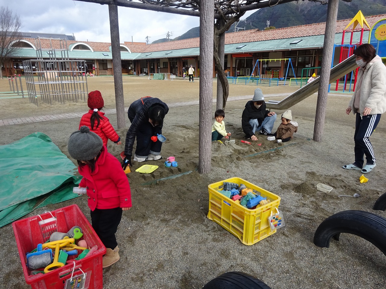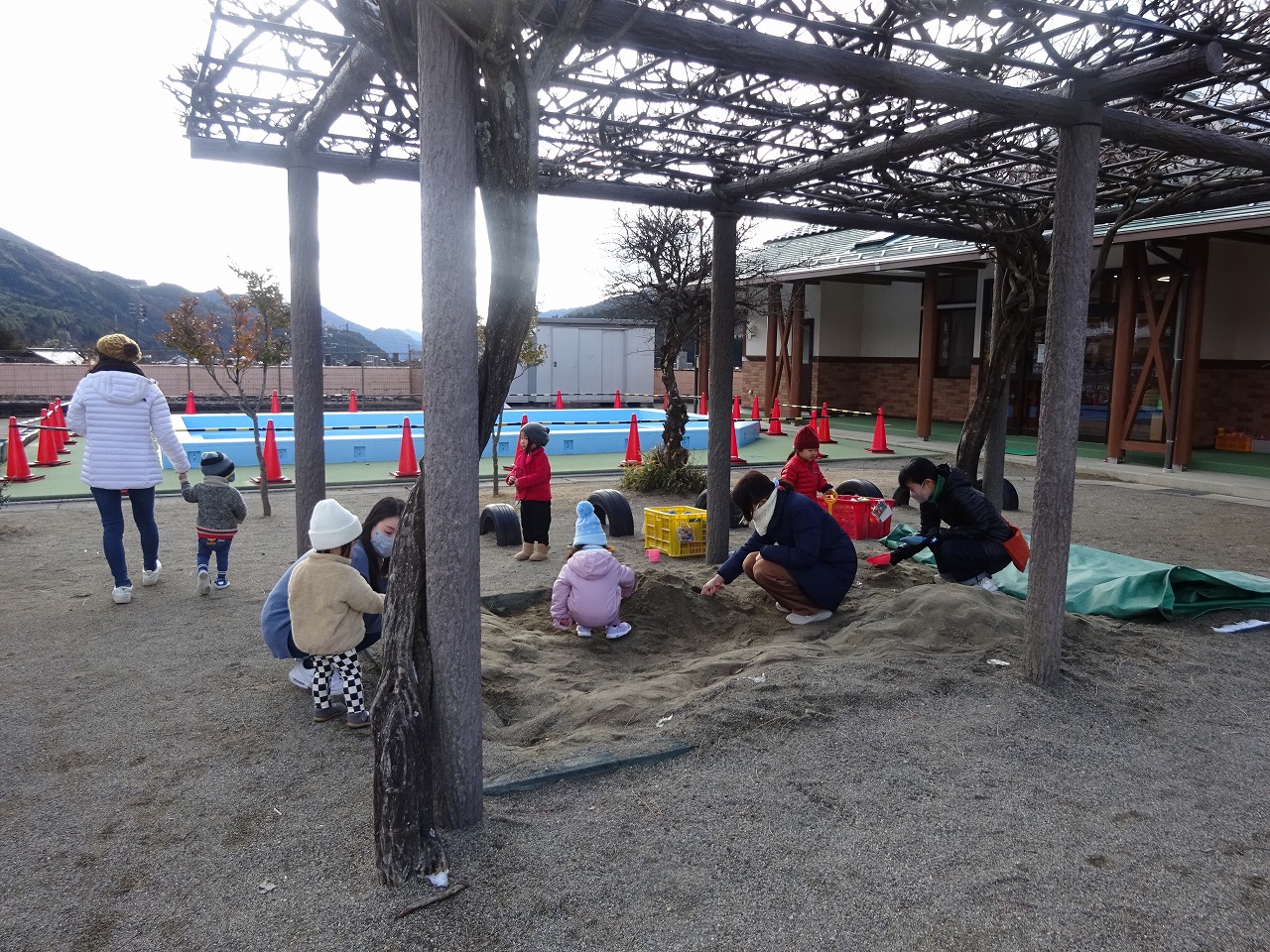 雪がちらつく寒い日でしたが、ブランコに乗ったり砂場でケーキを作ったり、お母さんと思いっきり走ったりと体をたくさん動かしながら遊びを楽しんでいました。途中から園児が外に出てくると、にぎやかな雰囲気を味わながらにこにこして大きい子たちの遊びを見ていたお子さんたちでした。