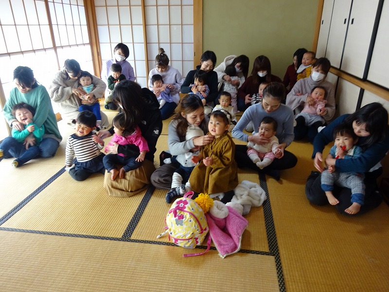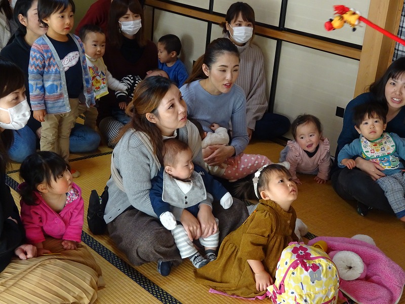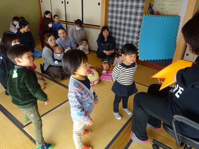 15組とたくさんの参加がありました。手遊びは3種。毎回トップバターの「東京都日本橋」は皆一緒に声を出しながら楽しめています。大人気のエプロンシアターは「赤ずきん」。皆の目が輝きながら先生に集中していました。その様子は微笑ましくもあり、とても可愛かったです。