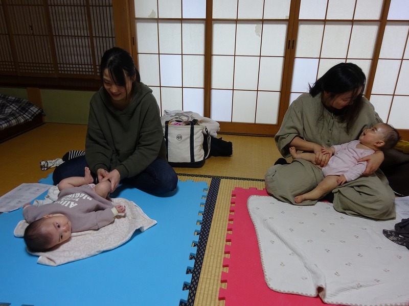 今回は10組の参加がありました。お兄ちゃんやお姉ちゃんが5人いて、いつもより賑やかでした。2ヶ月〜9ヶ月の赤ちゃんたちは、気持ちよくなって寝てしまう子、うつ伏せが嫌で泣いて怒る子、オムツが濡れていたり、眠かったりで、ずっと泣いていてマッサージが不可能だった子...さまざまでした。終了後先生は、一人一人のところを回って、コミュニケーションをとって下さいました。