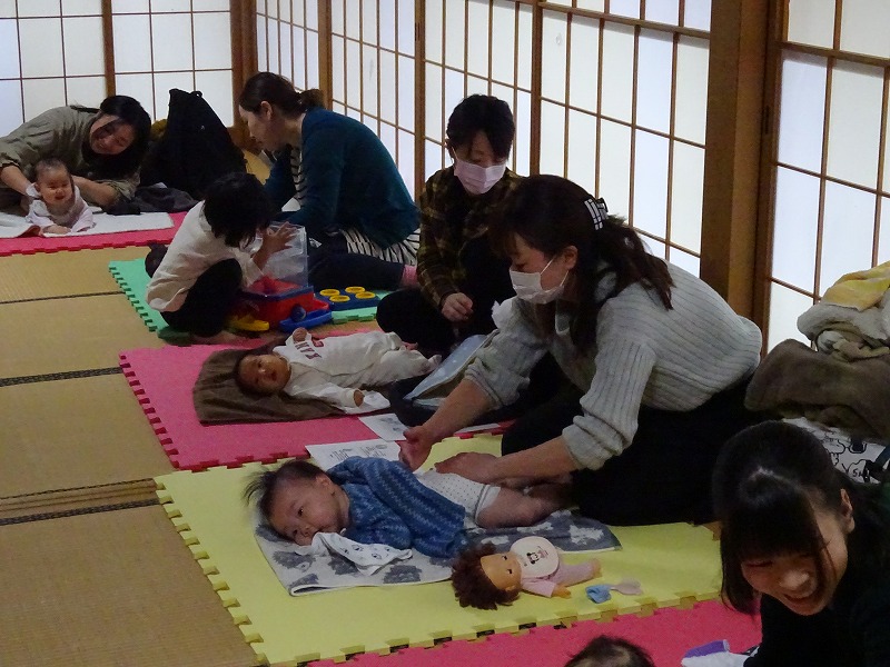 雪がちらつく寒い日でしたが、10組の参加がありました。今回はお兄ちゃんお姉ちゃんが5人いて賑やかでした。2ヶ月〜6ヶ月の赤ちゃんたちは、気持ちが良くて眠ってしまう子やずっと泣いている子等様々でしたが、いつも変わらないのはお母さんたちの我が子を見る温かい目とマッサージする手の優しさでした。こちらまで幸せ感が伝わってきました。