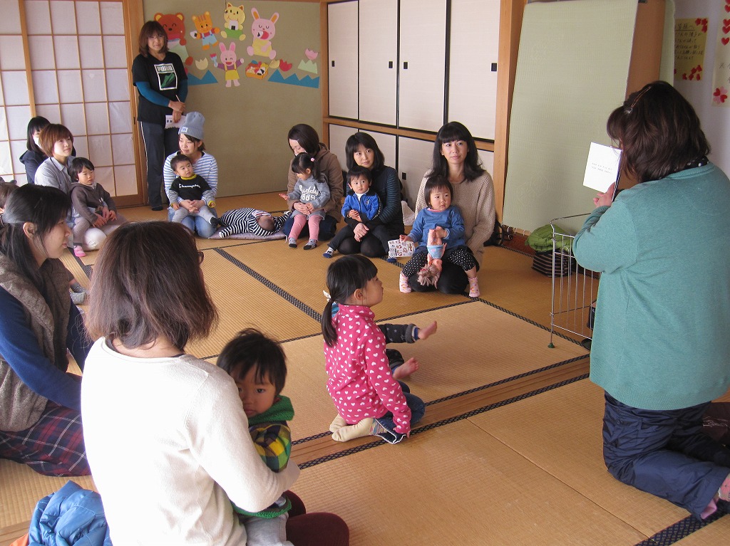 2、3人が先生の前に座り、あとの子はお母さんの膝で上手に聴けました。 内容は手遊び3種、絵本3冊、紙芝居2種でした。 途中で手遊び「納豆」のリクエストもあったりして、楽しみにして来てくれる子がいることが分かりました。