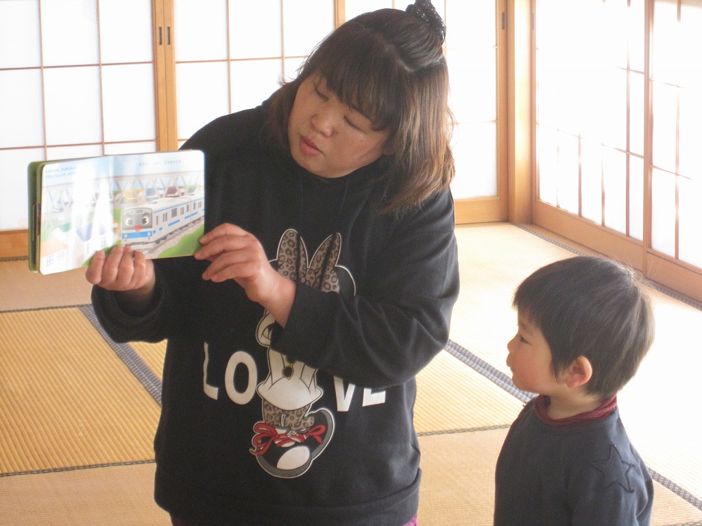 小さい絵本だけど、飛び出す電車のしかけ絵本は皆を引きつけました。