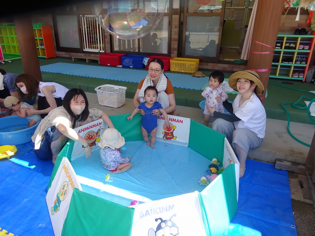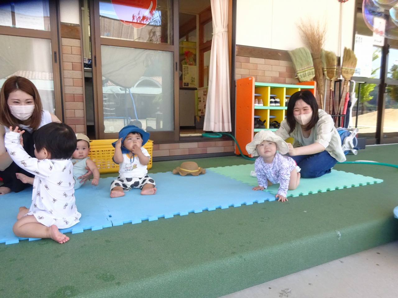 7月27日(木)乳幼児学級こりすくらぶ(今年度1歳になるいちごグループ)がおこなわれ、8組の親子が参加されました。 シャボン玉や水遊びをするのは初めてのお子さんが多かったですが、みんなでずりばいやハイハイをしながらお母さんたちがしてくれることに興味をもってキョロキョロ見ている姿がとてもかわいかったです。 同じ年の子を持つお母さんたちなので、いつもよりも話が弾み、和気あいあいとした雰囲気で楽しむことができました。今後もつながっていけるといいなと思います。