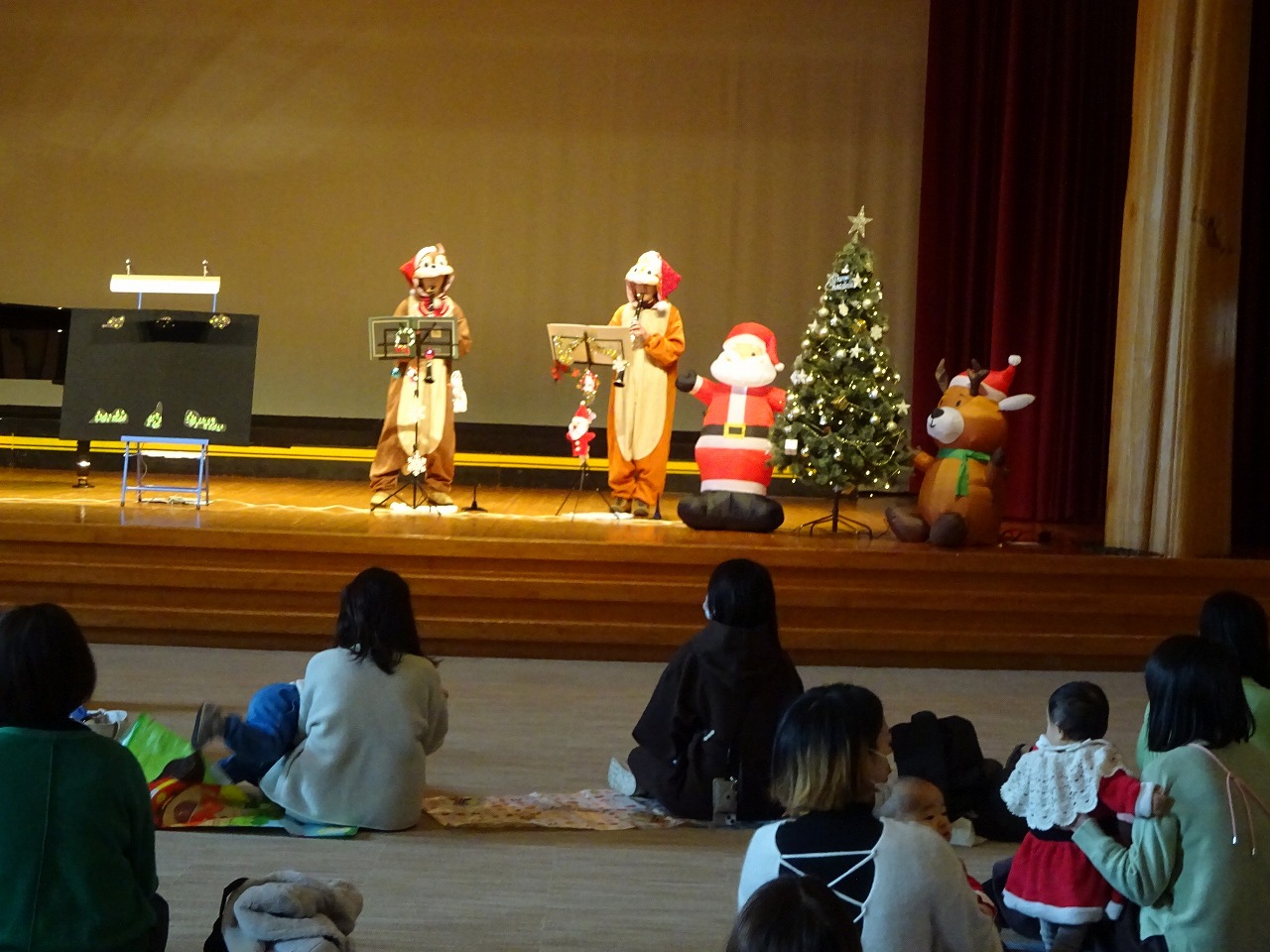 かわいいサンタさんの衣装で来場したお子さんも多く、会場のクリスマスの雰囲気にもピッタリでした。会では、最初にピアノ、クラリネットの演奏でクリスマスソングを奏でていただき、親子で体を揺らしながら本物の楽器の音に触れることができました。途中で大型絵本やパネルシアター、歌も入り、目と耳と体全体で音楽を楽しんでいたようでした。そしていよいよ鈴の音と共に、サンタさん、トナカイさん、アンパンマンサンタさんが登場!一人ずつサンタ型の音が鳴るプレゼントをもらい、大喜びしていたお子さんたちでした。最後にプレゼントを振りながら「あわてんぼうのサンタクロース」をみんなで合奏して楽しむことができました。