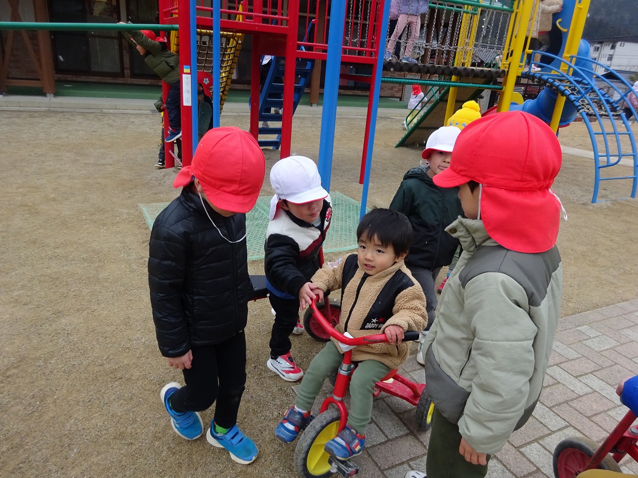 1月12日(金)園庭開放をおこない、7組の親子が参加しました。 雪がちらつく寒い日でしたが、園児がマラソンをしたり体操しているのを見て嬉しそうに体を動かして遊んでいました。来年度年少さんになるお子さんたちがたくさんみえたので、砂場や大型遊具、三輪車で一緒に遊ぶ姿がみられ、ほほえましいやりとりに成長を感じてみえたお母さんたちでした。園児さんたちも小さい子と遊ぶのがとても楽しかったようでした。