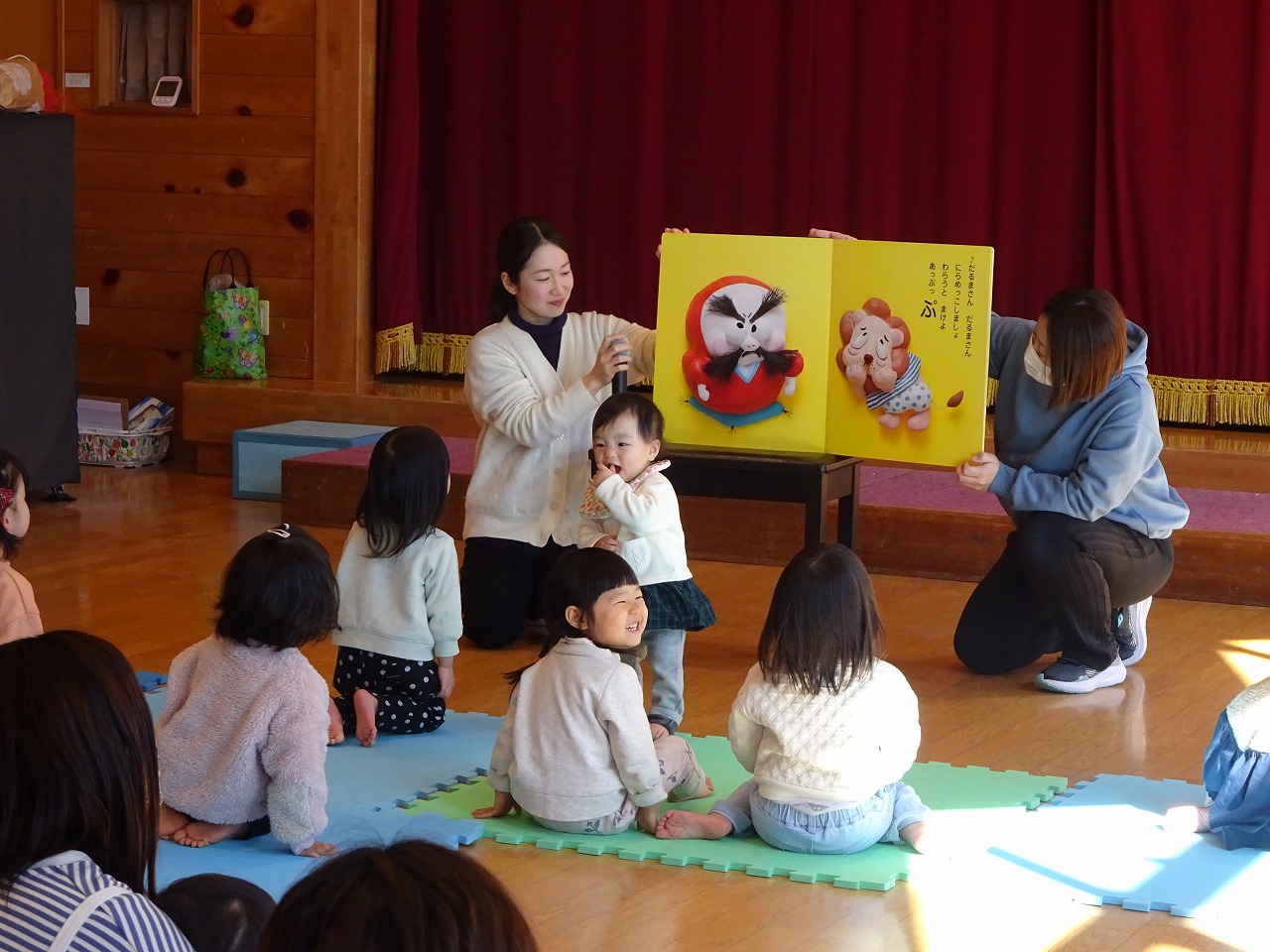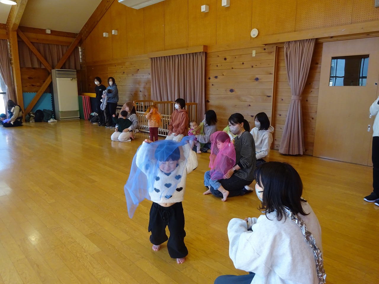 2月13日(火)きたこども園の遊戯室で馬瀬子育て支援センター、北児童館合同の「リトミック」をおこないました。前回参加した方も多く、最初から体をたくさんつかってリズムあそびを楽しむことができました。今回はふわふわの布を用意していただいたので、1人1枚ずつ持って色々なものに見立てながら不思議な布の動きを楽しんでいました。来月は今年度最後となるのでたくさんの音に触れて楽しんでいきたいです。