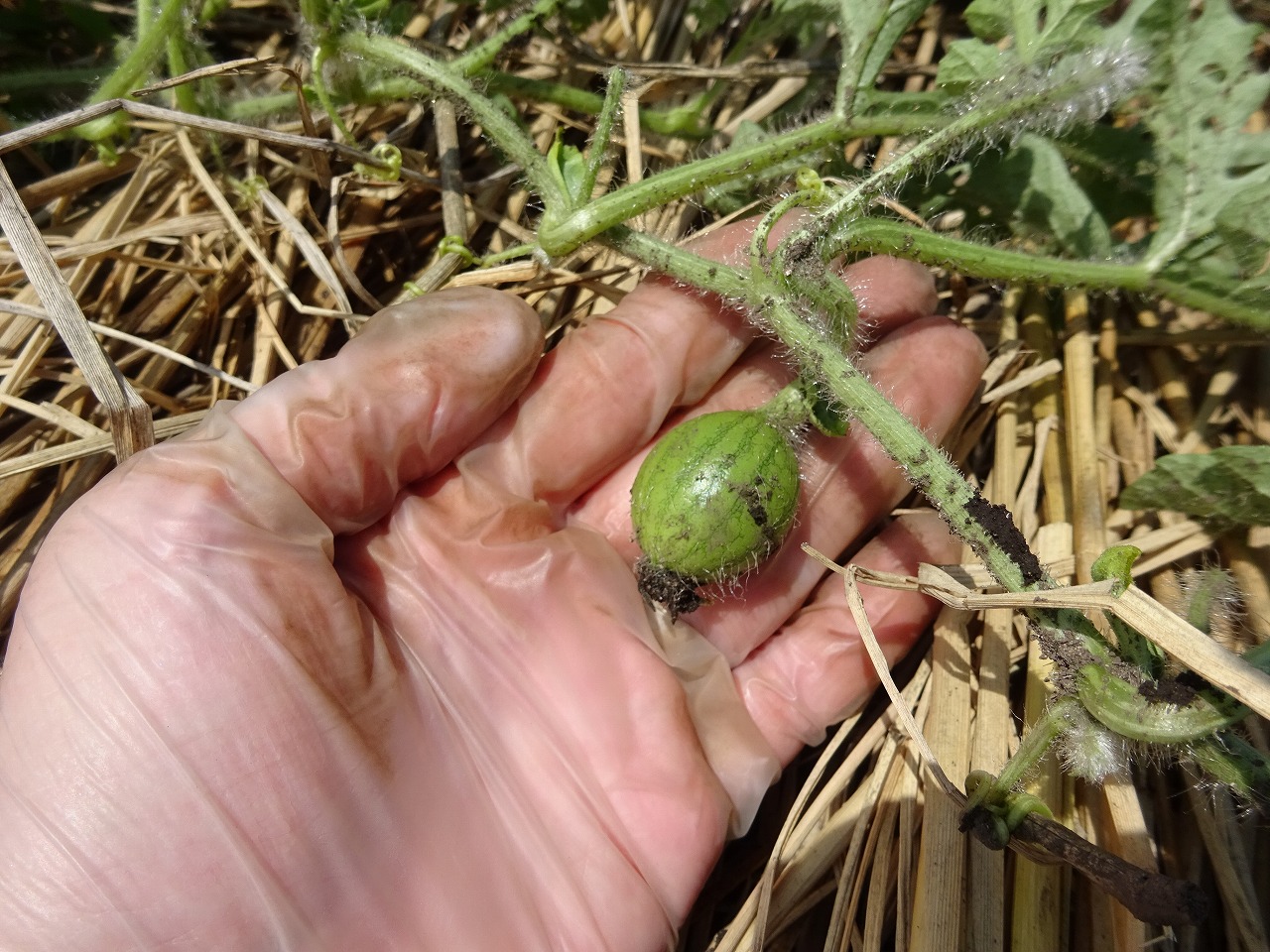 季節は梅雨になり雨降りの日が続いています。畑の作物たちにとっては『恵みの雨』。雨水を沢山飲んでグングン生長していますよ。(雑草たちも喜んでいます…)梅雨の晴れ間に草取りをしました。なんと…スイカの赤ちゃんが!こんなに小さくてもシマシマ模様があるんですよ!参加者を募って農園活動を行うことは出来ませんが、時間のある時に親子で畑を覗いてみてくださいね。 |