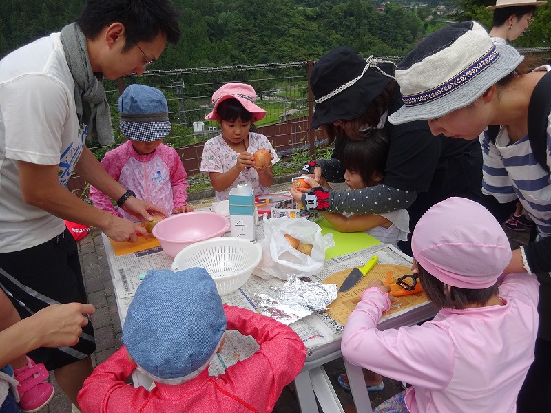 山之口にある位山自然の家のバーベキュー会場にて、Dayキャンプを行いました。29組103名の参加がありました。カレーライス作りでは、ピーラーを使って、親子で皮をむいたり切ったり、また災害時用炊飯袋での米炊きにも挑戦。川までの道のりのポイントラリーに、ヨーヨーすくい。川遊び等楽しみました。みんなで作ったカレーや「流しデザート」、盛り沢山内容でみんな笑顔の1日でした。 |