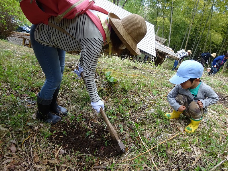 小坂のふれあいの森で竹の子掘りを行いました。竹林の中で竹の子を探し当てると夢中で掘ってみえました。子どもたちはその側で「ママがんばれー」と声援!竹の子を掘りながら食事談義に花が咲きました。たくさん採れた竹の子はどんな料理に変身するのか楽しみです。 |