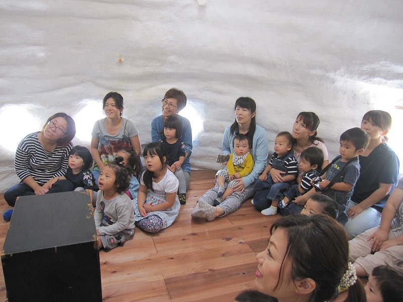 のどかな野原で親子でゆぅたりと過ごしました。ピザ作りは生地作りから焼くまでをお手伝いして、焼き立ての熱ーいピザを美味しく食べました。アースドームではナナ子さんによる人形劇を見せてもらい、本物みたいに動く人形に大喜びの子どもたちでした。 |