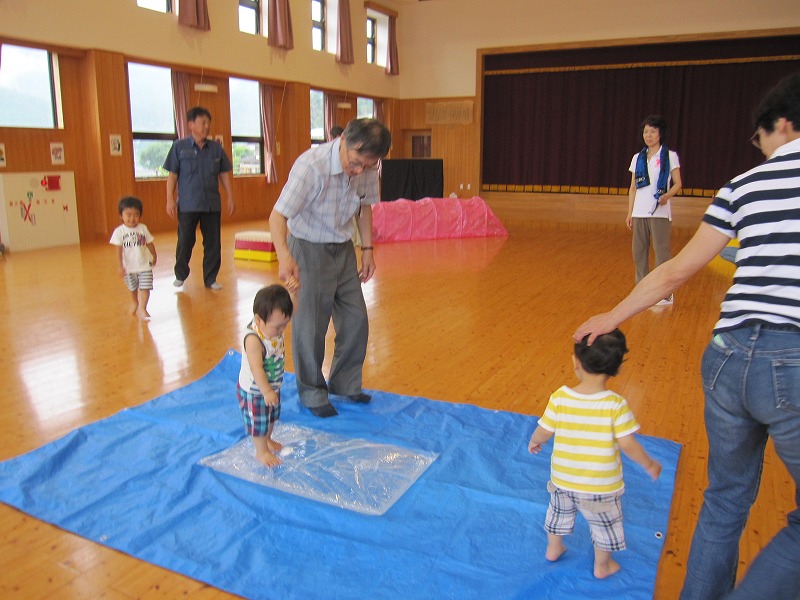 広い遊戯室で走ったり、サーキットをしたり新聞遊びをしたりしました。子どもたちと一緒になって走って汗をかいて楽しんで下さる、おじいちゃん・おばあちゃんの姿がとてもステキでした。最後に傘袋でロケットを作って飛ばしました。すーっと飛ぶロケットを見て、・大喜びの子どもたち。体をいっぱい動かして、子どもたち・祖父母の方々の笑い声が沢山聞こえ、ほのぼのとした活動となりました。 |