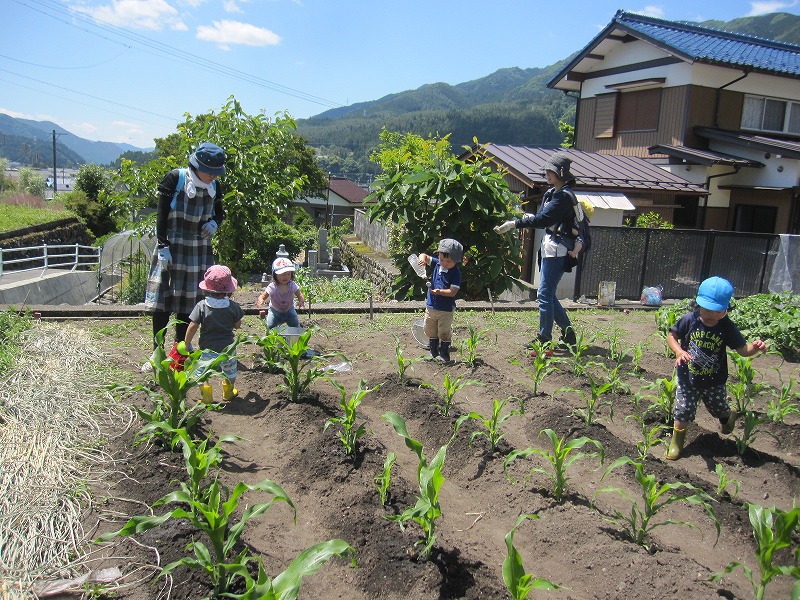 久しぶりに農園に向かうと、4月、5月の初めに植えた作物が大きくなっているのに親子で気づき、喜ぶ姿が見られました。じゃが芋、スイカの剪定と草取りを行い、その側で子どもたちは手や顔が真っ黒になりながら土いじりを楽しんでいました。 |