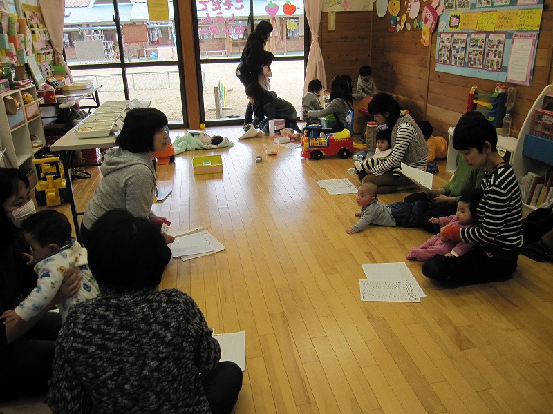 2月生まれの誕生会を行いました。今回、2月生まれのお子さんの参加はなかったのですが、1月生まれで前回参加できなかった、1歳になったお子さん2名が参加してくれました。手遊び「チャイム鳴らして」でお母さんに顔を触ってもらうと、とっても嬉しそうな表情をしていたのが印象的でした。 |