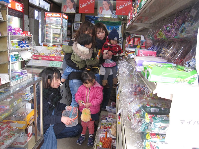 身近な地域にある駄菓子屋さんへ30円を財布に入れ、みんなで買い物に行きました。お店の主人、今村さんにみんなで「おはようございます!!」と挨拶した後買い物をしました。「何にしようかな」「どれがいいかなあ」と親子で相談しながら楽しく買い物ができました。 |