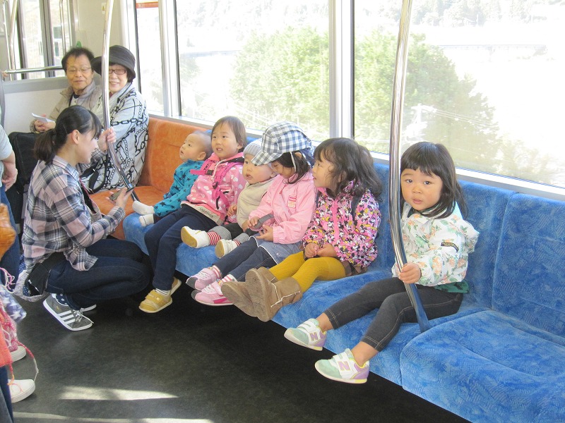 とても良い天気の中、18組もの親子で列車に乗って、小坂のきこり公園まで行きました。電車の中でのマナーもちゃんと守って、みんなニコニコ窓の外を眺めたり、1番前の運転席をのぞいたりとても楽しそうでした。公園では家から持参したおやつを1つ食べその後はのんびり公園内を走り回ったり芝生の築山を転げ下りたり、走り下りたりして、体を沢山動かして遊びました。 |