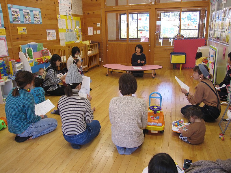 今回のぽっかぽっかDayは『遊んで育つ 子どもの体』というテーマで、長江奈香保育士に話しをしていただきました。普段、何げなく行っていることが、実はとても大切なことであり、子どもの一つ一つの動作に言葉をくっつけて、ちょとした遊びに展開していく方法を知るだけで、子どもの気持ち満たされていくことを教えていただきました。とても有意義なぽっかぽっかDayとなりました。 |