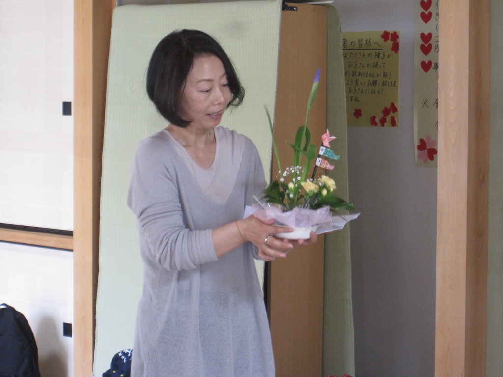 花菖蒲やスプレーカーネーション・かすみ草などを使って、自由に生け、折り紙の鯉のぼりやフェルトの花をあしらいました。半数が初体験の方々。最初のドキドキが次第にワクワクに変わり、とても楽しい時間となりました。 |