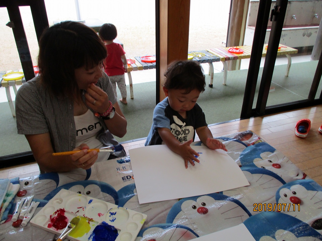 しゃぼん玉あそびと季節の壁面でさかな、かに、たこを手形で作りました。 あいにくの雨ふりでテラスで行いました。 風もない日でしたので、シャボン玉が高く飛ぶ様子を見ることはできず残念でした。 壁面の手形を親子で押してくれ、賑やかな壁面となりました。