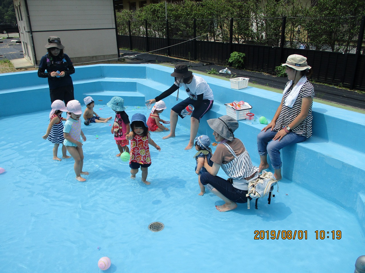 水で溶いた片栗粉で感触を味わいました。 子ども達は手から流れ出る感触が気持ちいと感じる子は少なく、すぐ手を洗って落としたい子が多かったです。お母さんたちは不思議な感触を楽しんでいました。 プールあそびでは金魚やヨーヨーをプールの中に入れてすくったりと楽しんでいました。 暑い日だったので水が心地よく感じ、最後まで楽しむことが出来ました。