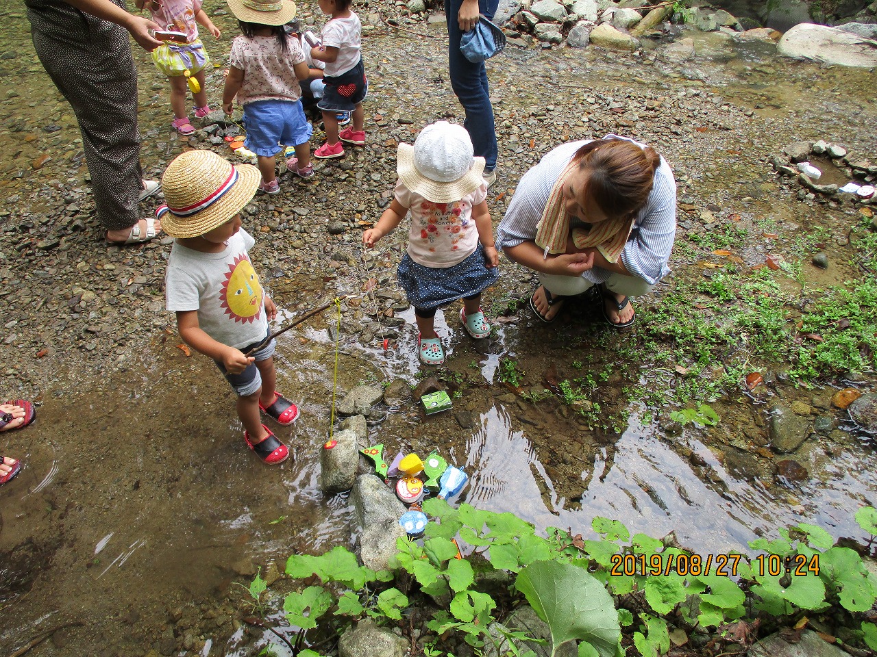 萩原子育て支援センターとのコラボで馬瀬の森のニンジャで遊びました。 魚釣りとCHIHIRO(ジップライン)のグループに分かれて体験しました。 CHIHIROの体験では勇敢に一人で乗れる子、怖がって断念する子もいました。 魚釣りではカラフルな魚を作ることを楽しみました。 まきまきパンの生地は、フワフワで簡単に棒にまくことができ、上手に焼いて美味しく食べることができました。
