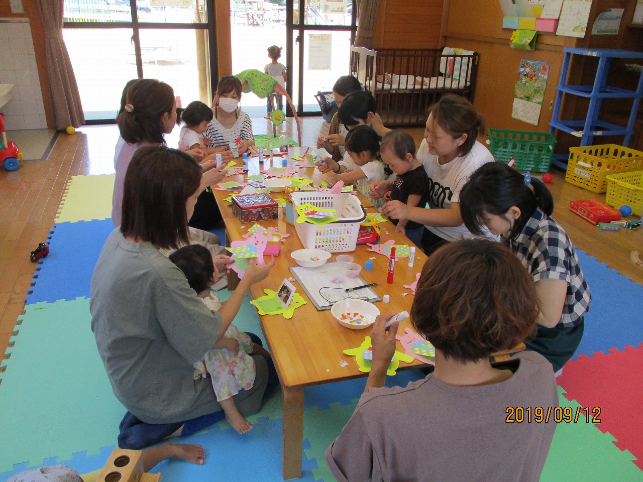 敬老の日にプレゼントするためにマスキングテープや型抜きを使ってうさぎとクマの台紙でメッセージカードを製作しました。 中には子どもの可愛い写真を貼りお母さんからの感謝のメッセージが添えられました。 マメールで萩原地区の方への案内もできるようになったため、今回は5組の参加がありとても賑やかでした。