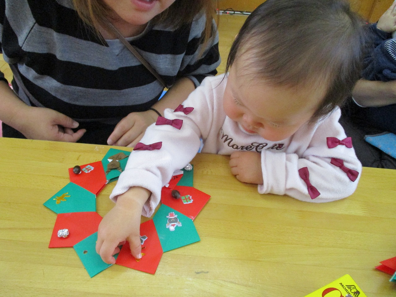 折り紙を折ってリースの台を作りました。折り紙をすることがないお母さん方は、一枚二枚目までは苦戦してみえましたが、慣れてくると要領がよくなり2種類の色で5枚ずつ綺麗に折り、組み合わせてリースの台を完成させました。サンタクロースとトナカイを付け、後は自由にどんぐりや星・天使のシールを貼って素敵にデコレーションして仕上げました。子ども達は、サンタクロース・トナカイの顔を描いたり、シールを貼って楽しみました。