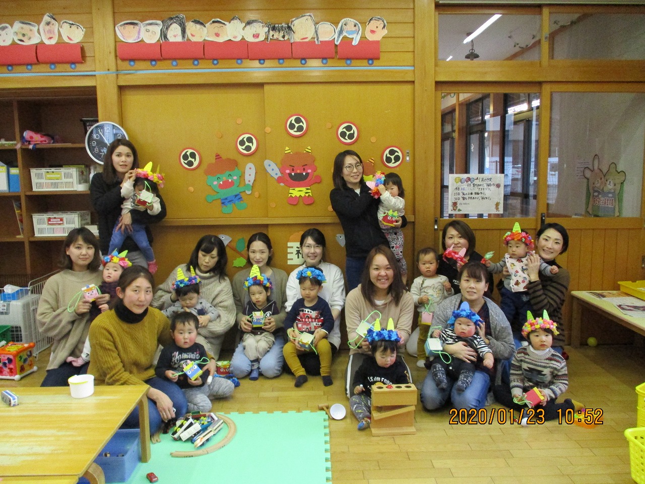 最初に豆箱作りから行いました。髪の毛がついている面に目のシールを貼り、一本角・二本角と各自で切って貼ってもらったことで、色々な表情の鬼の豆箱が出来上がりました。次に鬼のお面作りでは、フラワー紙を親子でくしゅくしゅと丸めて貼りました。赤鬼、赤鬼、カラフル鬼の可愛い鬼さんが出来上がりました。