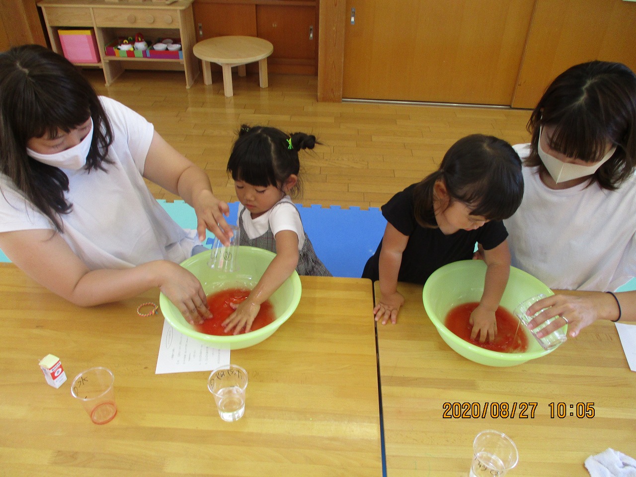 2歳・3歳のお子さんを対象に行い6組の親子が作りに来てくれました。水・洗たく糊を混ぜてぬるぬるするところにホウ砂液を少しずつ混ぜると、段々と固まりスライムの完成‼ とっても簡単に出来上がり、固まっていく様子に感動がありました。伸ばしたり、ぐちゃぐちゃにしたり、手の間から流したりとたくさん触って遊べました。