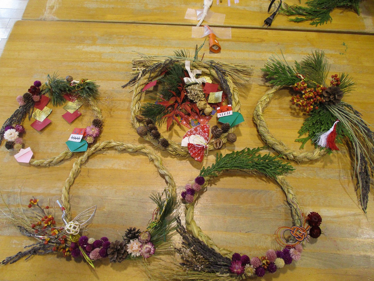 2日、9日と地域の方々にしめ縄を作っていただき、藁を扱いて水につけ藁を昔ながらの木づちで叩き本格的な作り方で作っていただきました。16日遊戯室で飾り付けを行い5組の親子の参加がありました。皆さん工夫やアイディアいっぱいで素敵な作品となり、楽しんで飾り付けができて良かったです。世界に一つだけのしめ縄飾り、お正月が楽しみですね。