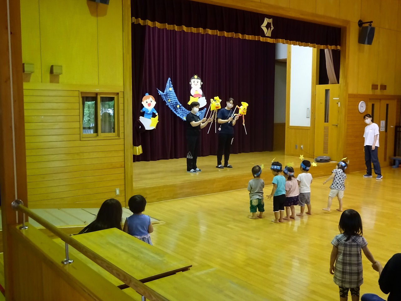 遊戯室へ移動して、天の川に見立てたトンネルをくぐり星を1人1つ取るゲームを行いました。子どもたち上手にくぐって星を取ることができ、単純なゲームでしたが楽しむことができました。最後に星の彦星、織姫が出てきて一緒にたなばたの歌をうたいました。