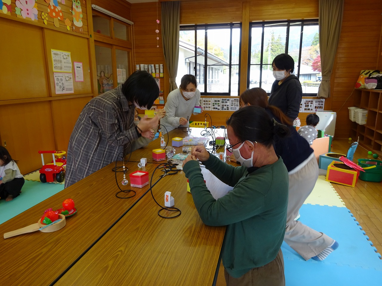 講師:水谷晃子さんに教えていただきました。5組の親子の参加。 どんなビーズを使おうか悩み、細かいビーズに悪戦苦闘して見えましたが、みなさん素敵なサンキャッチャーが出来上がりました。 久しぶりの細かい作業だったが気分転換になった。日々の子育てにホット一息、心にキラキラ光りを取り込めるように一番日当たりの良いところに置こうと思うなど感想がありました。楽しんで製作できて良かったです。