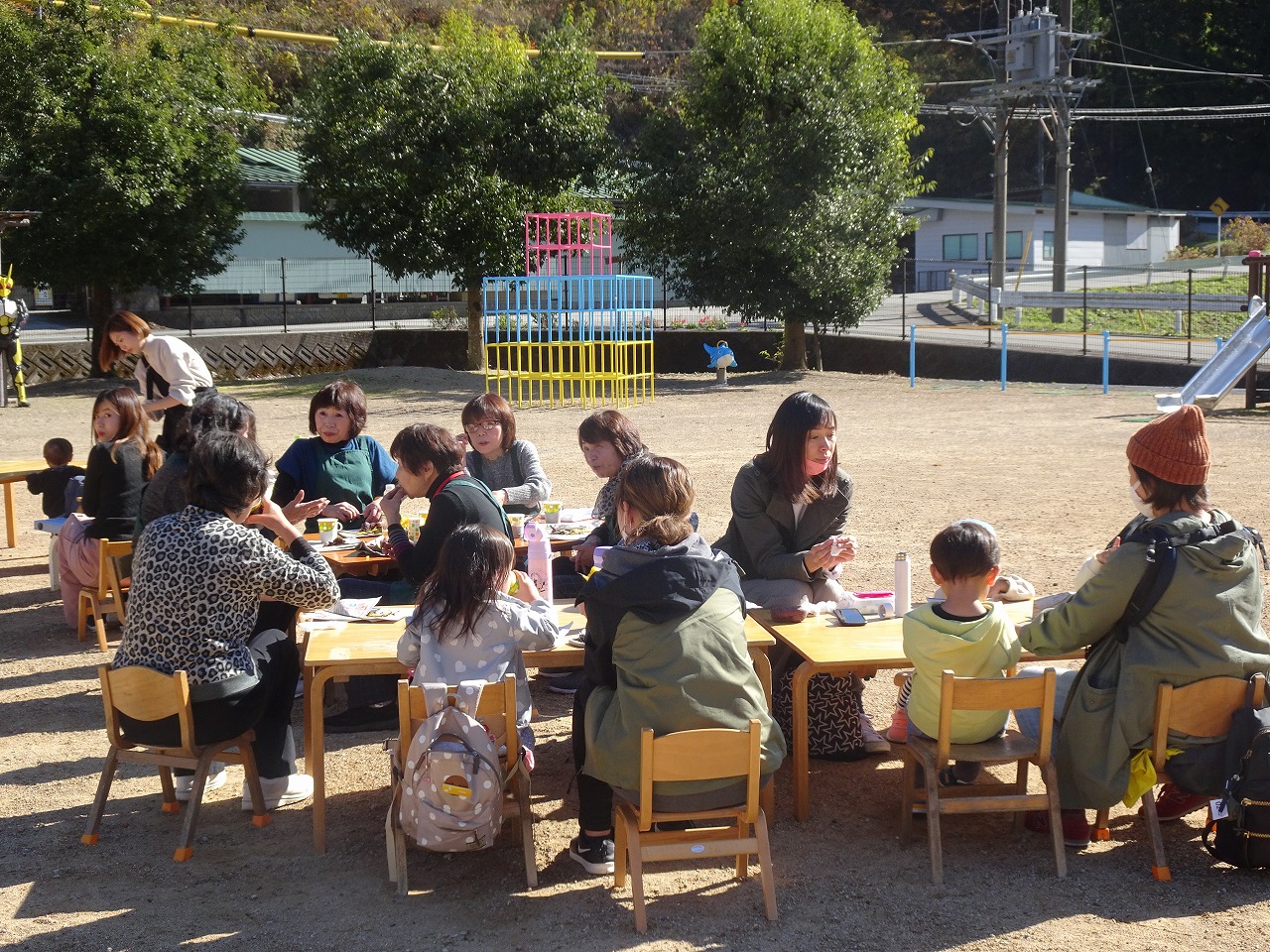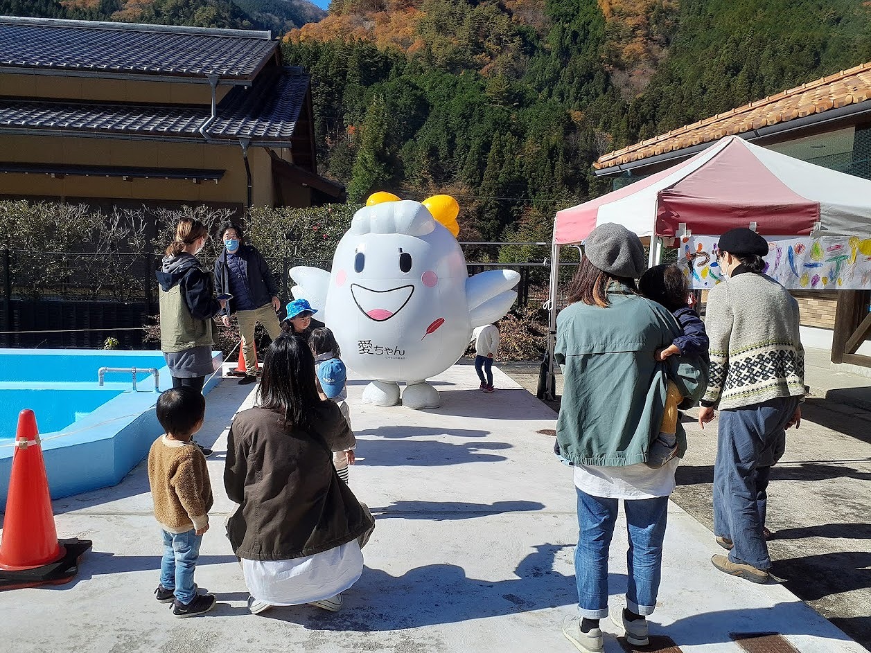 青空の下、13組の親子とほのぼの館を利用してみえる地域の方と一緒に園庭でアツアツホカホカの焼き芋を食べました。今年のさつま芋は水分が多く甘くて美味しいさつま芋でした。皆さん美味しいと喜んで食べてくれました。 社協から共同募金の愛ちゃんが来てくれ、触れ合うこともでき楽しい焼き芋パーティーとなりました。