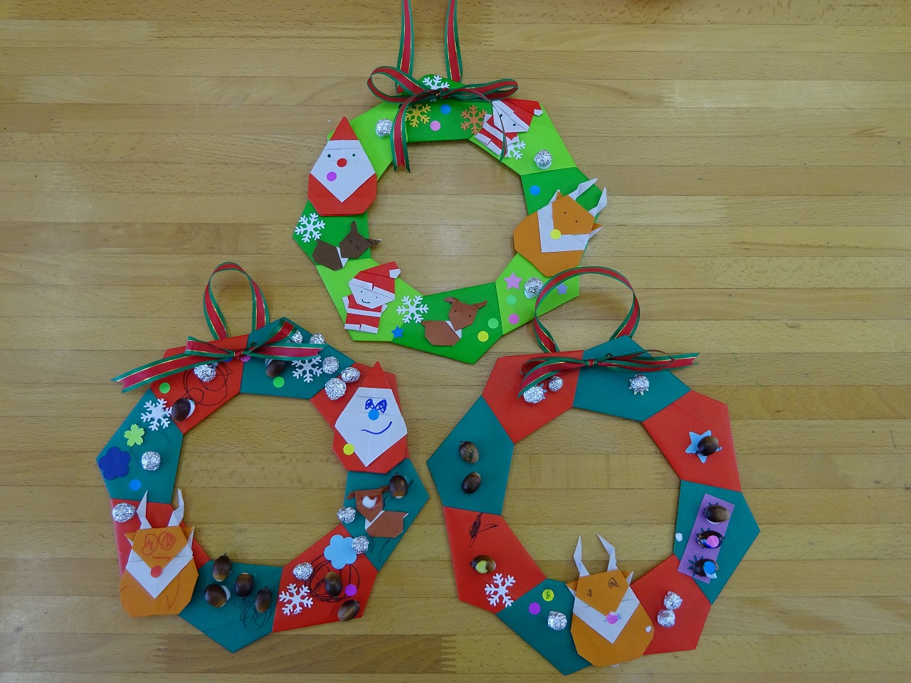 折り紙で折ったリースに飾り付けをしてクリスマスリース製作を行いました。