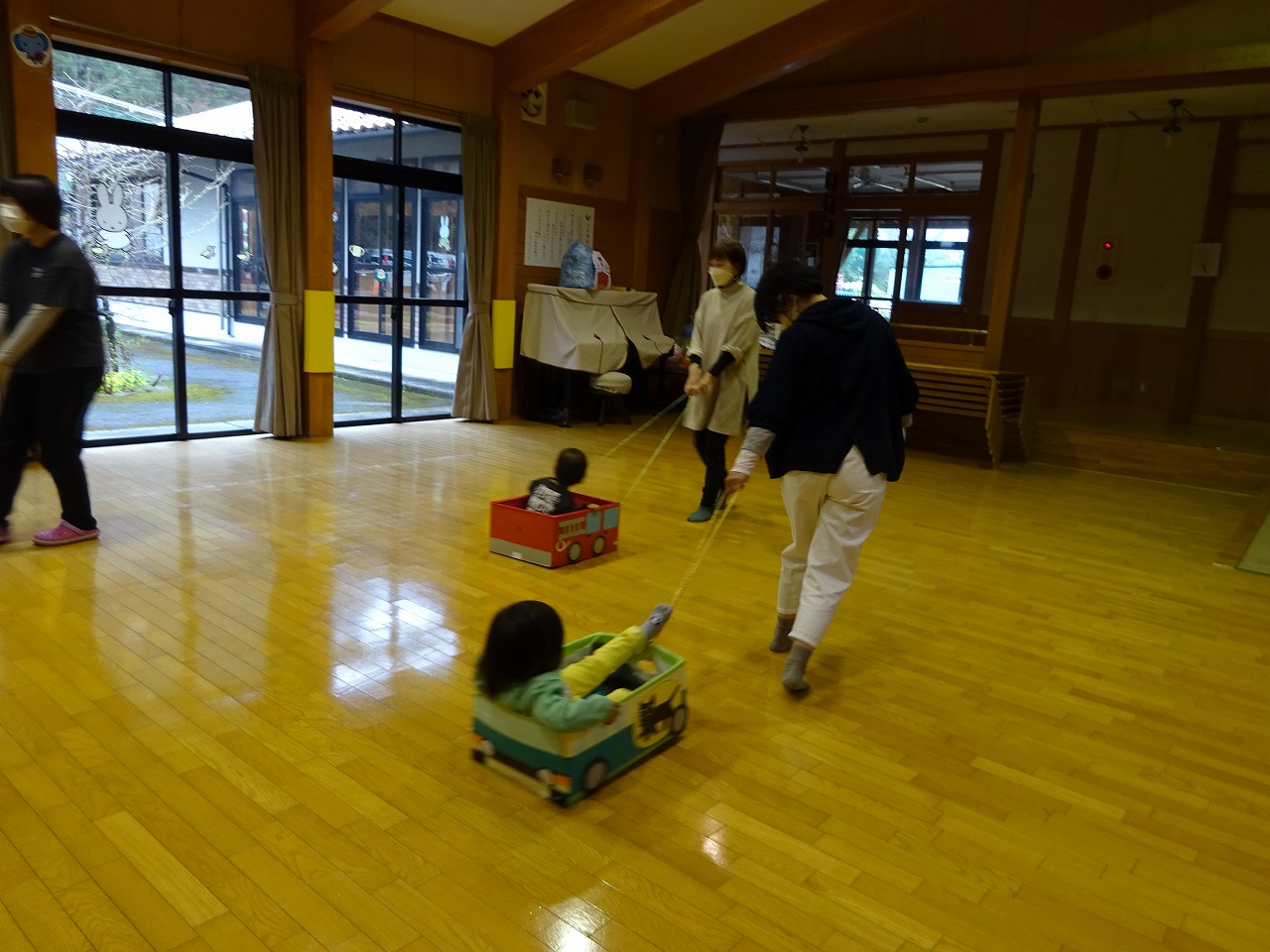 そして、箱車(消防車、パトカー、黒猫宅配車、ドクターイエロー)と4台あるため、順番に交替しながら、お母さんに引っ張ってもらい遊戯室をたくさん走ることができました。ボールあそびをしたり、最後にアンパンマン体操をみんなで踊り、適度に汗をかき体を動かしてふれあい遊びを楽しむことができました。
