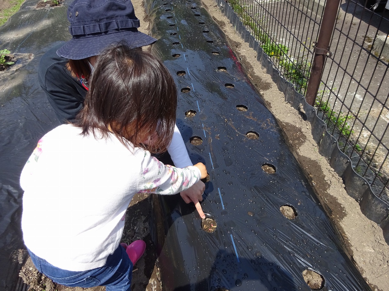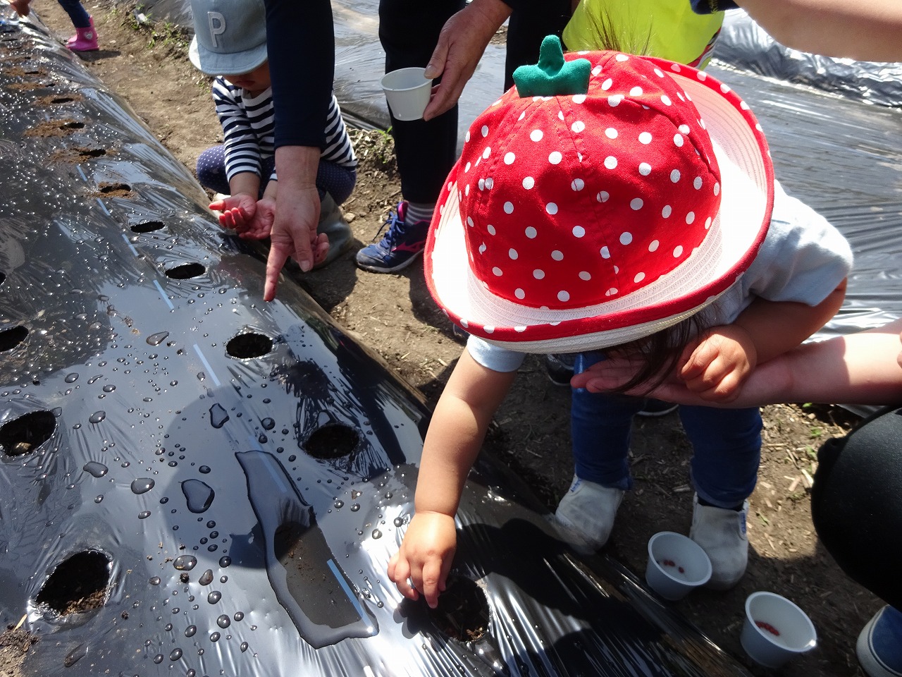 3組の親子と未満児の子どもたちで行いました。マルチに開けてある穴の中に種を3つ入れ、土をかけてからジョウロ、ペットボトルジョウロで水を順番にかけました。50個の穴の中に種を入れたので芽が出てくるのが楽しみです。今後、間引きを行い遊びに来た時には、生長観察をしながら水やりをして生長を楽しみにして欲しいと思います。