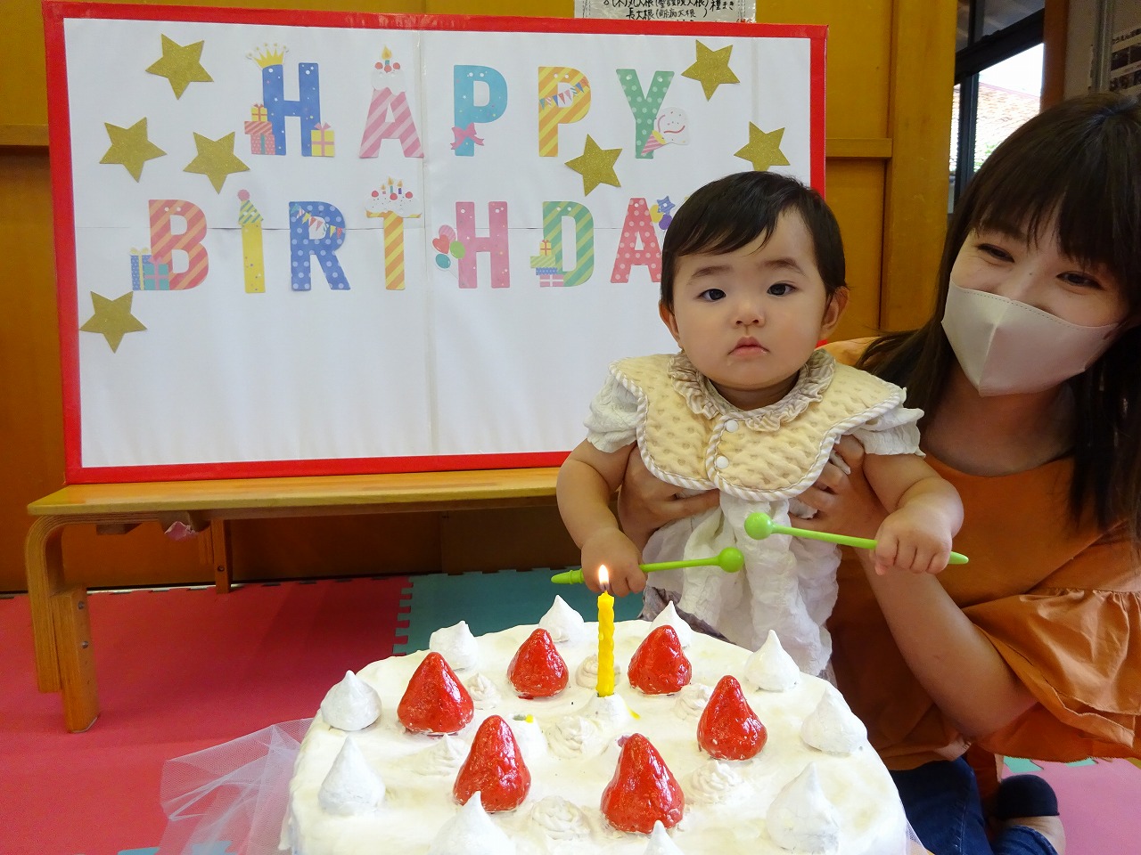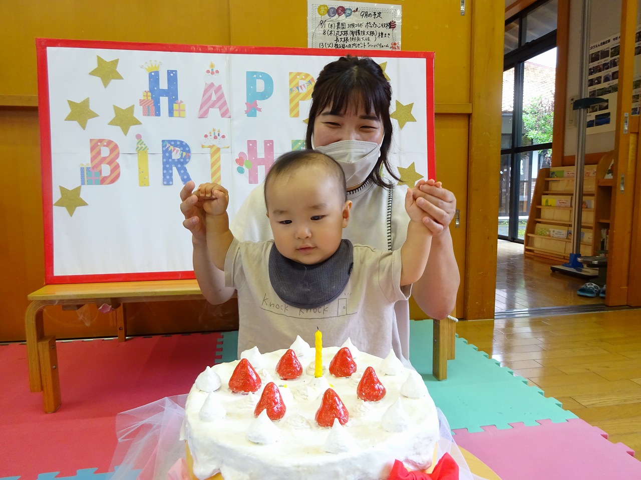 ロウソクの吹き消しはお母さんと一緒に行いました。お楽しみは「いないないば」と「くだもの」の絵本を読み、バナナが大好きな男の子は指差しや声を出して興味をもって見てくれました。たんじょうかい後も好きな玩具を出して仲良く遊んでいってくれました。