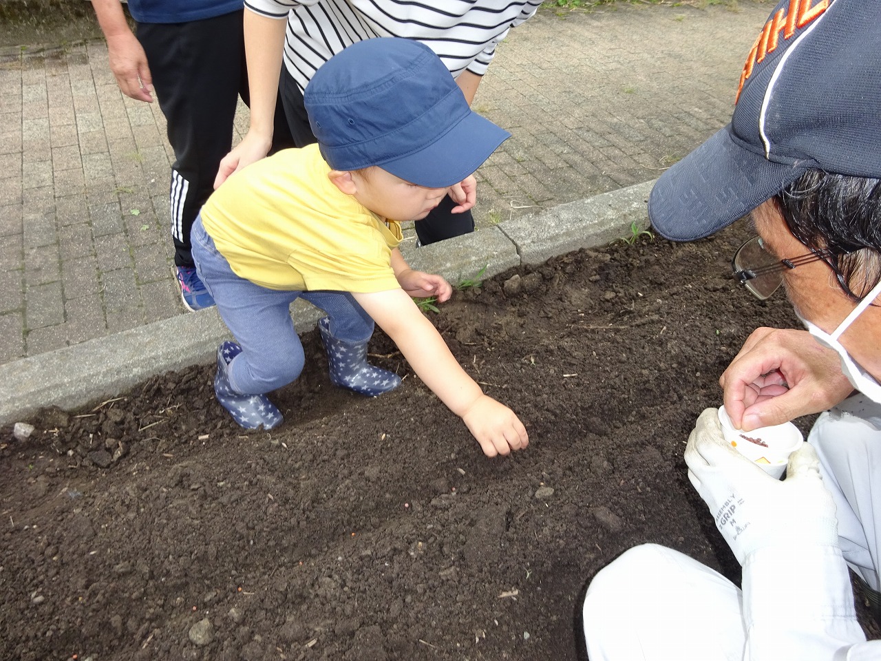 3組の親子と未満児の子どもたちで行い、初めに種のまき方を教えてもらいました。 小さな種を少しの間隔をあけてまくのは大変でしたが、子どもたちは1粒ずつもらってまいてくれました。 丸大根も長大根も3列ずつまくことができ、芽が出てくるのが楽しみです。土をやさしくかけてからペットボトルに水を入れたっぷりかけてあげることができました。
