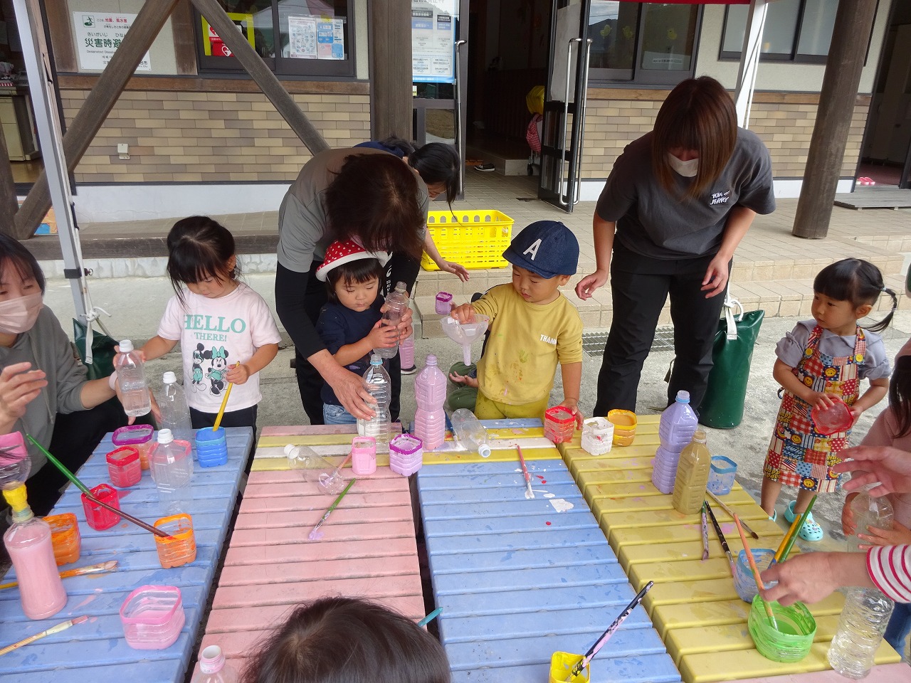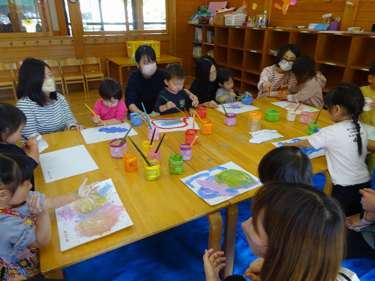 先に筆や手を使って描いたこともあり、個々の画用紙にも好きな色を選び自由に描くことができました。今回は絵に枠を付け絵画のようにして持ち帰ってもらいました。暖かい日だったので戸外で色水あそびも行いたくさんの色を交ぜて色の変化を楽しみました。