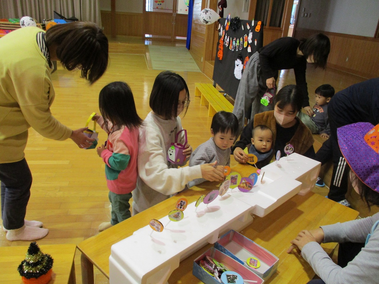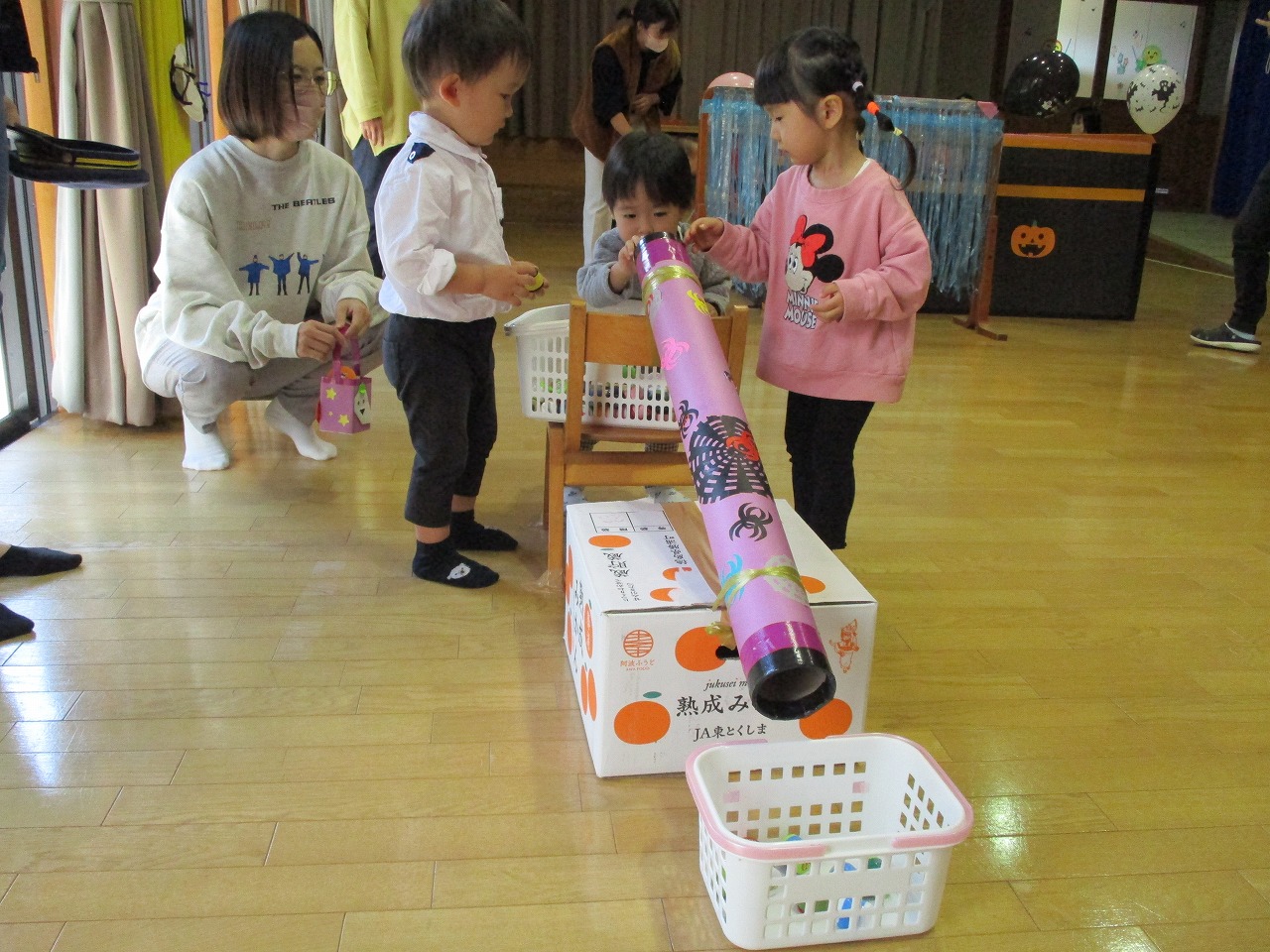 製作では、見本を見てもらったり、自由に作ってもらうことで個性豊かなオバケの顔になり可愛いお菓子入れが完成しました。遊戯室では7か所のコーナーがあり、いろんなコーナーを何度も回り最後まで遊戯室であそびを楽しむことができました。一番人気は、筒の中にペットボトルの蓋で作った物を転がすコーナーでした。子どもたちにとって単純に転がすだけのあそびが楽しいんだなと思いました。