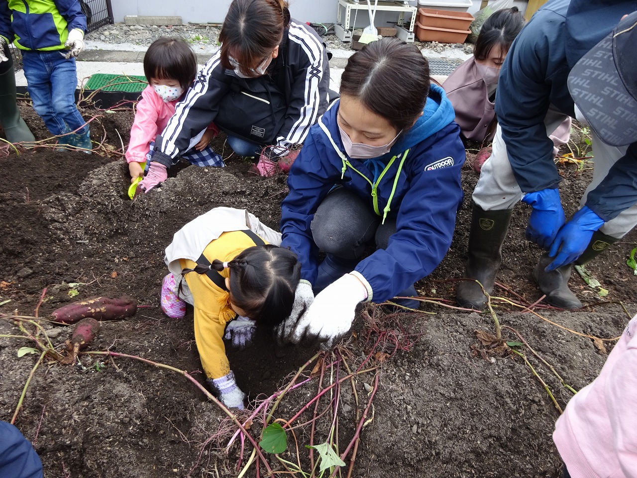 3組ずつ畝に入ってもらい蔓を引っ張り、次々に出てくるさつま芋に喜びの歓声があがりました。大きいお芋がついていて何か所か掘り出す体験をしてもらうことができて良かったです。大中小を選び3つ持って帰ってもらいました。味わった感想をまた聞いてみたいと思います。