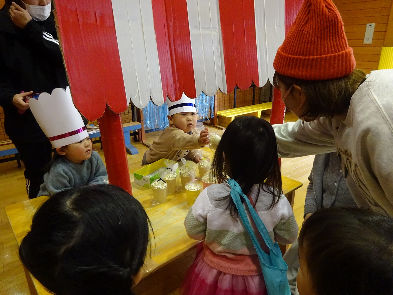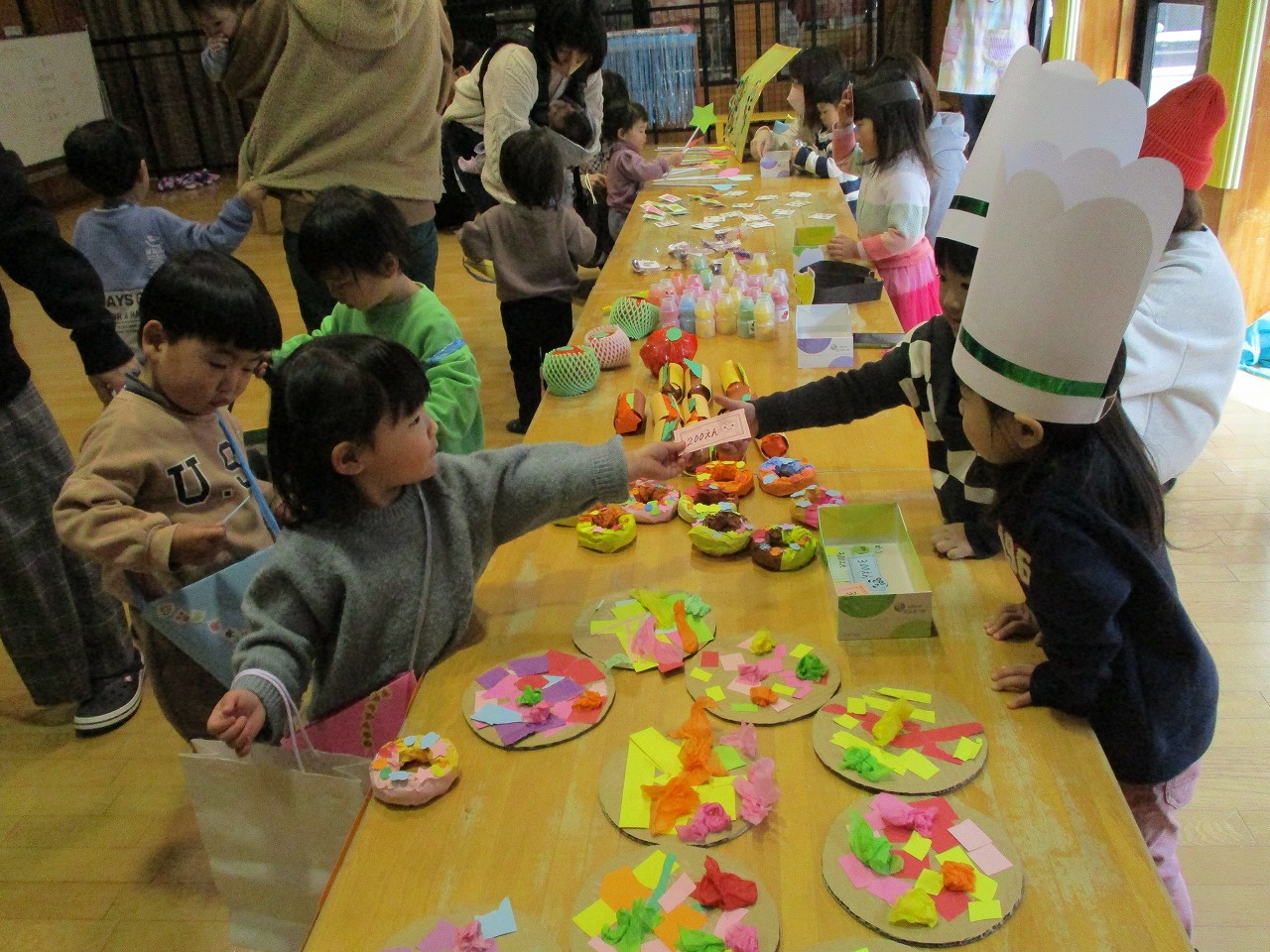 11組参加がありました。パン屋さん、おもちゃ屋さん、くだもの屋さん、ポップコーン屋さんの4つのお店の売る人はくじ引きで決め、値段は各自好きなように決めてもらいました。「いらっしゃいませ」「100円です」と年少に上がる子どもたちは上手に言えお金のやり取りもとても上手でした。また、自分の財布からお金を出すお釣りをもらうのも嬉しい様子でした。看板つくりや品物作りを園児の子どもたちにも手伝ってもらったおかげで盛大なお店屋さんごっこができました。