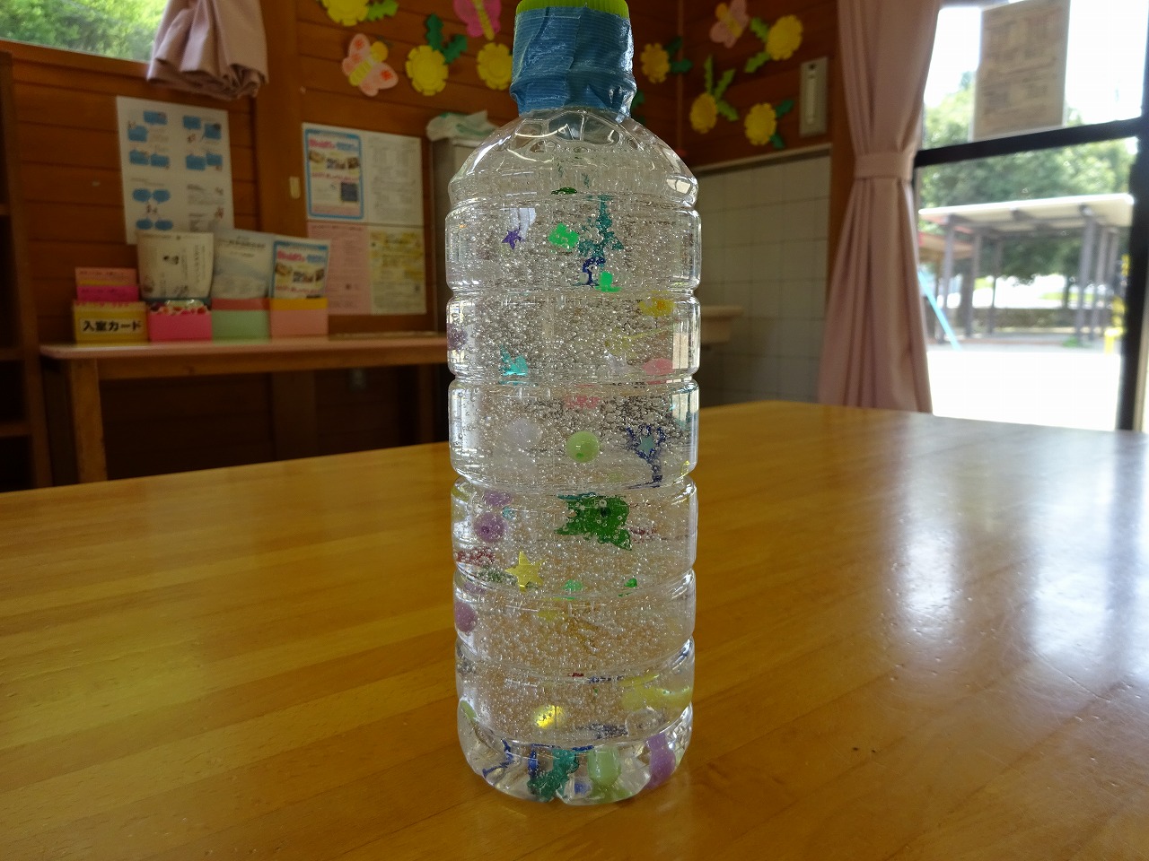 ペットボトルにビーズ、洗たく糊、水を入れるだけでビーズがゆらゆらキラキラペットボトルの完成です。