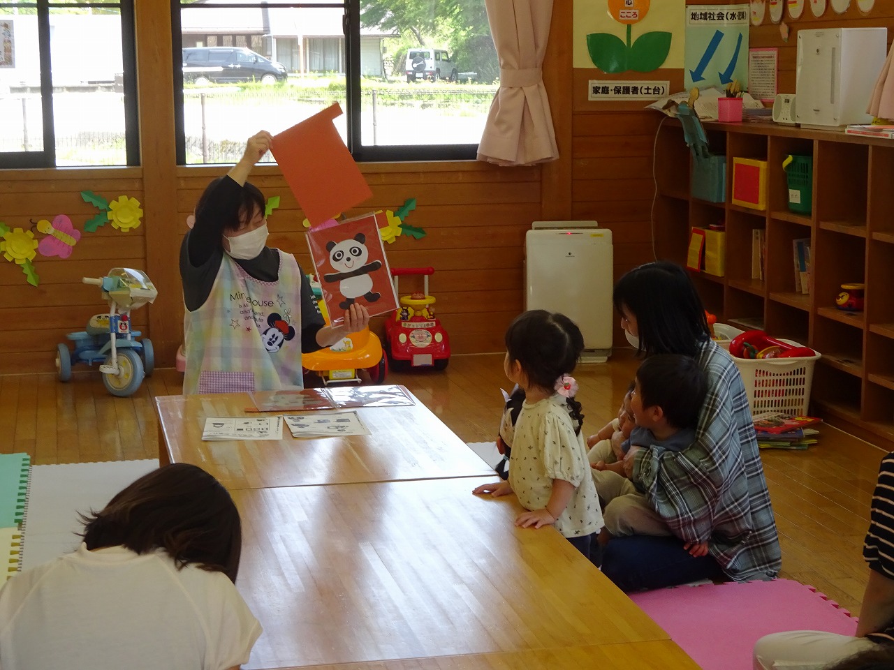 お楽しみは「どろんこだあれ」を行いました。久しぶりに手作りの出し物披露です。「どろんこどろんこだあれ」と唄いながら子どもたちがどろんこになっている動物を当ててくれました。うさぎ、こあら、パンダの動物がきれいになり、みんなで「パンダ、うさぎ、こあら」の手遊びを楽しみました。